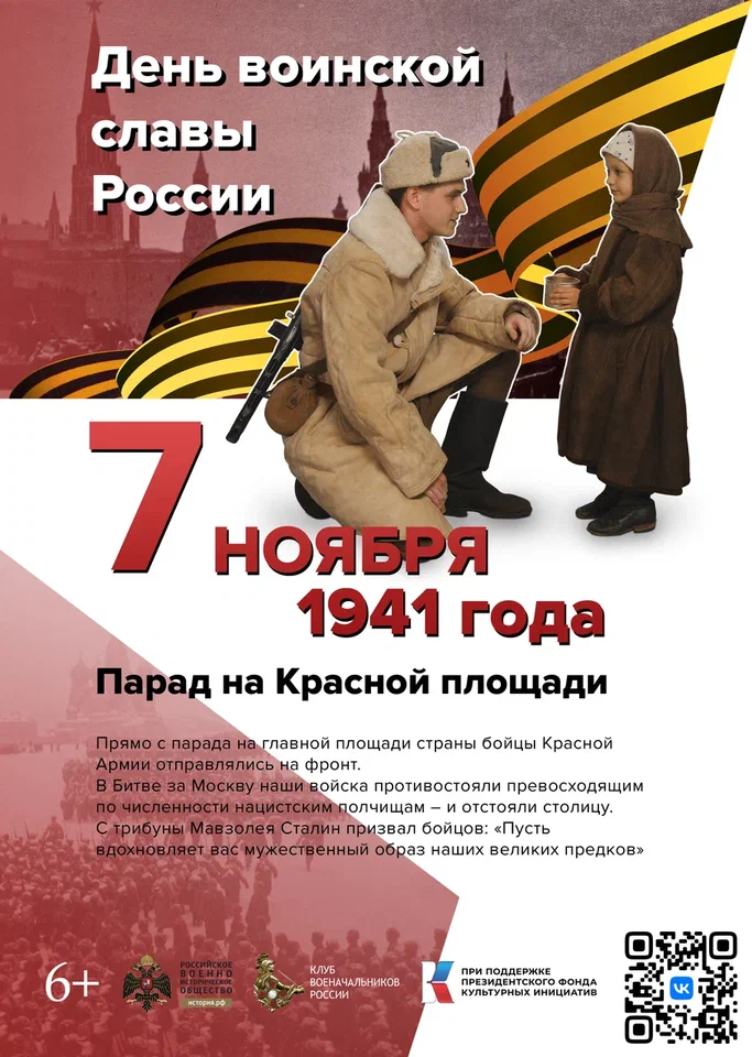7 ноября Россия отмечает День воинской славы, который связан с историческим событием — военным парадом на Красной площади, прошедшим в 1941 году во время Битвы за Москву